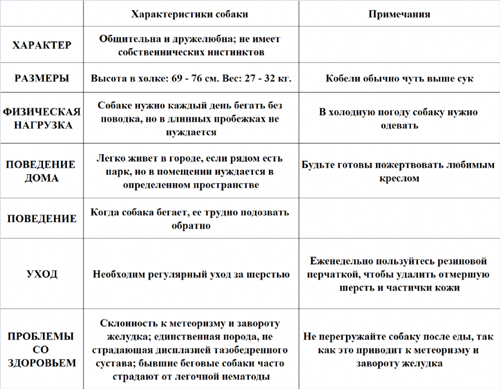 Если вы заводите собаку этой породы – будьте готовы к продолжительным прогулкам. Грейхаунд должен свободно бегать, чтобы выплеснуть накопленную энергию и быть в форме. Ведь английские борзые склонны к полноте. Кормить грейхаунда следует небольшими порциями 2-3 раза в сутки. От калорийного одноразового питания нужно отказаться